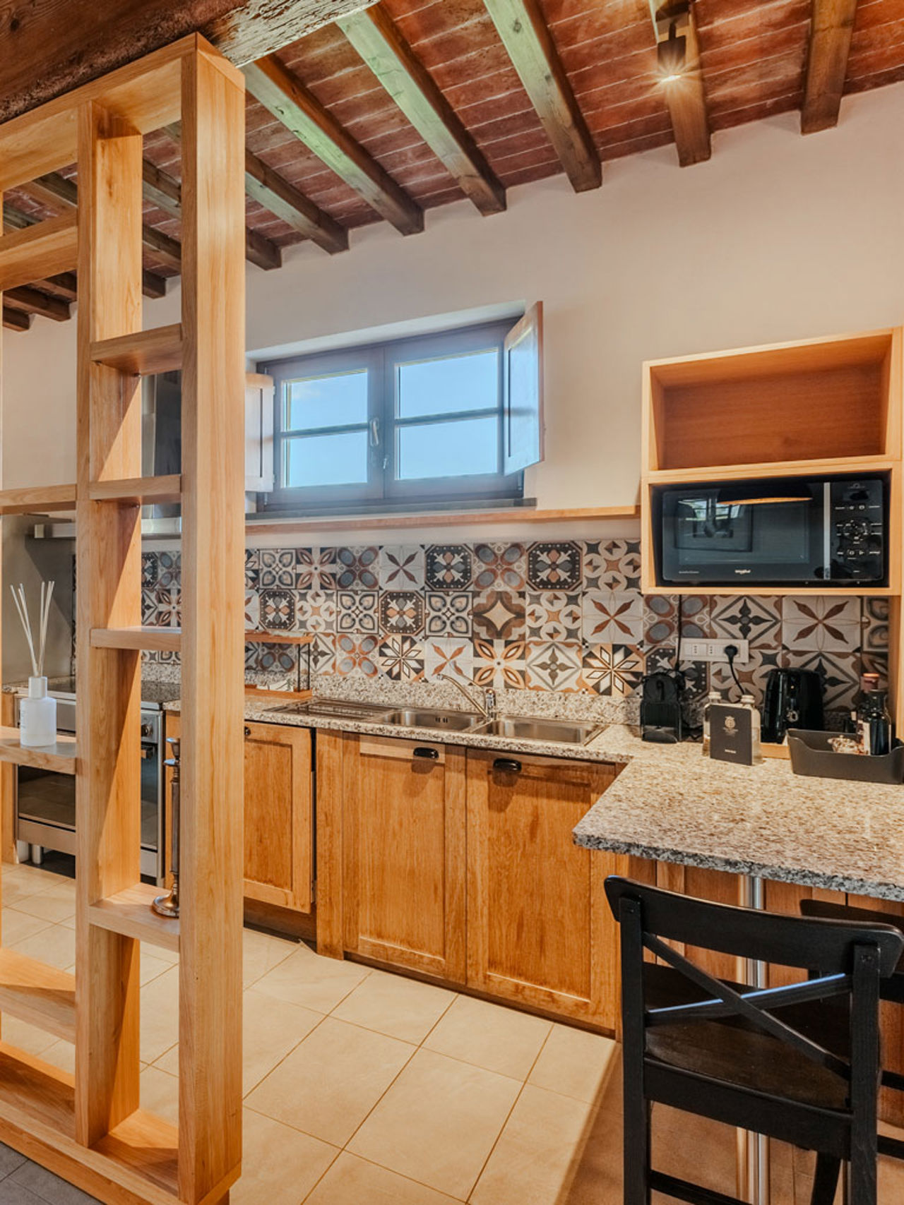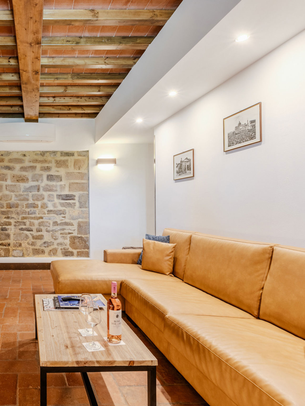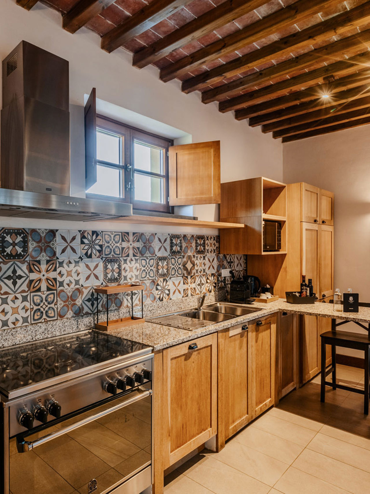 Lo stile è quello autentico delle residenze toscane, con travi a vista, pavimenti in cotto, pareti in pietra viva. Una bellezza sobria che prosegue nella veranda esterna, il vero cuore pulsante dell’appartamento, dove assaporare la colazione nella calma del mattino, o un bicchiere di vino al tramonto, circondati da un paesaggio che riempie gli occhi di bellezza.