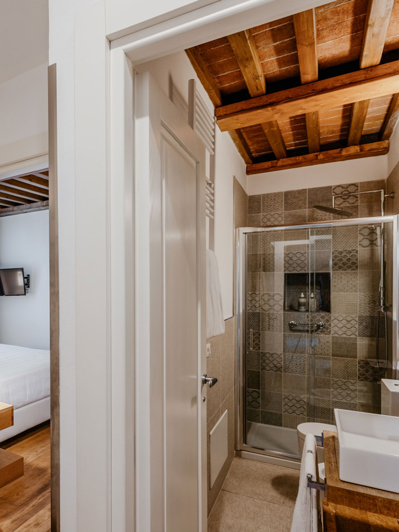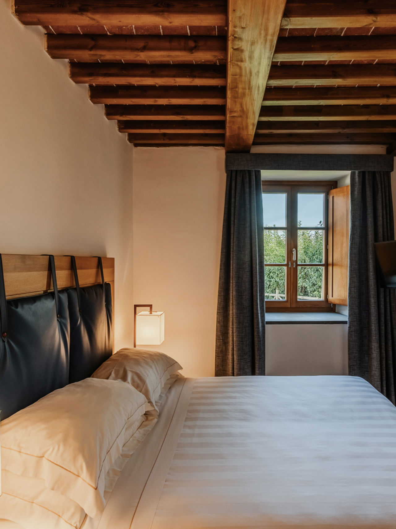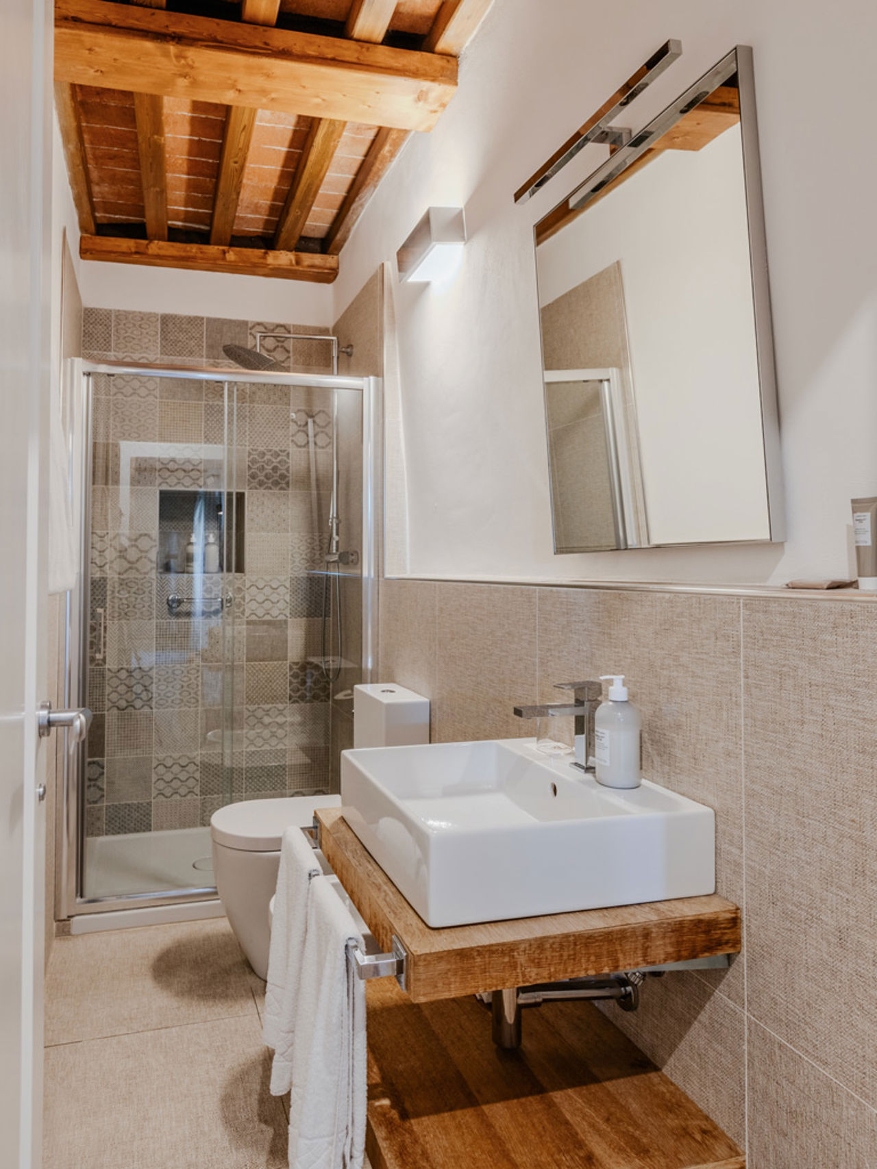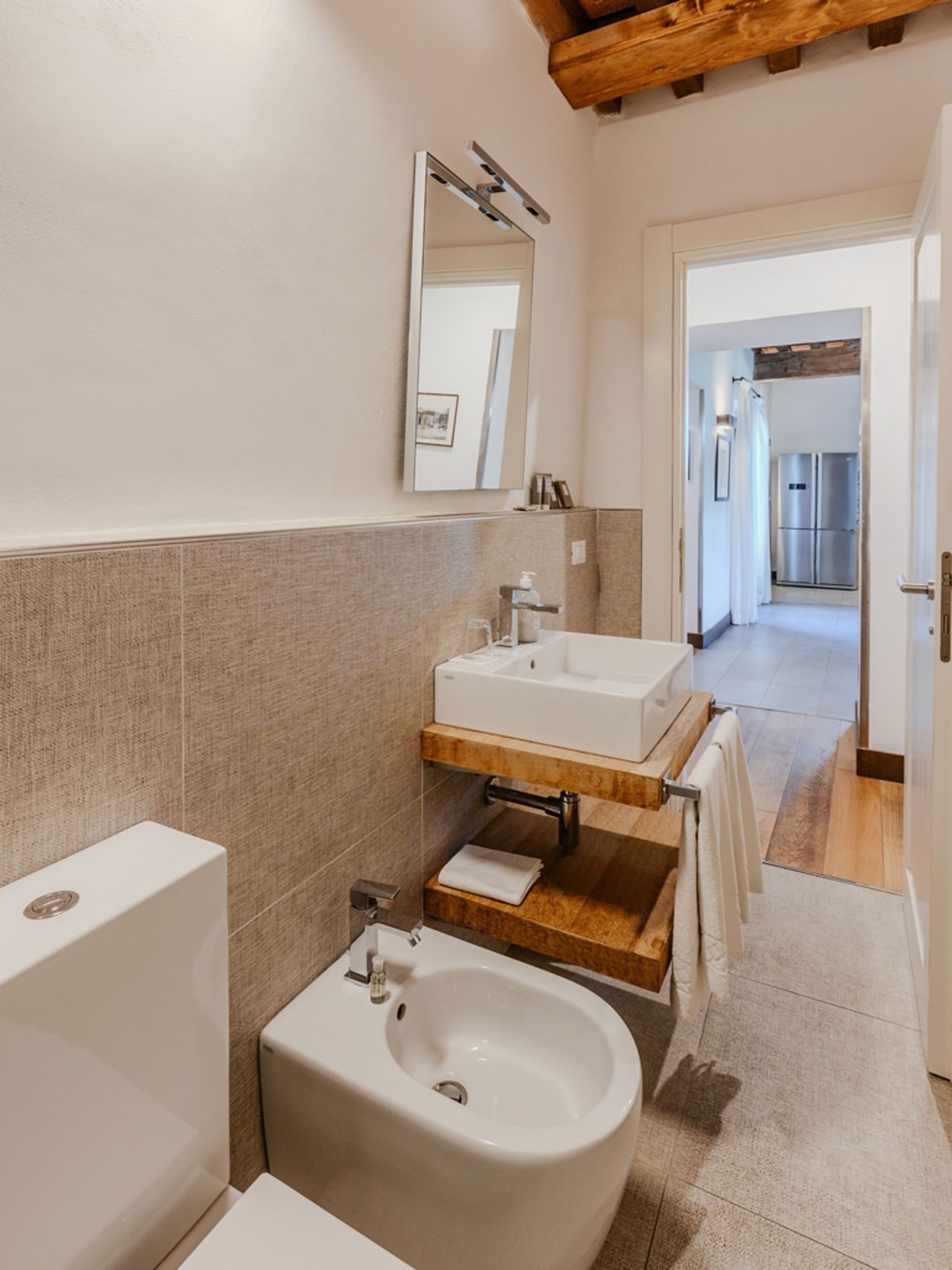 Lo stile è quello autentico delle residenze toscane, con travi a vista, pavimenti in cotto, pareti in pietra viva. Una bellezza sobria che prosegue nella veranda esterna, il vero cuore pulsante dell’appartamento, dove assaporare la colazione nella calma del mattino, o un bicchiere di vino al tramonto, circondati da un paesaggio che riempie gli occhi di bellezza.
